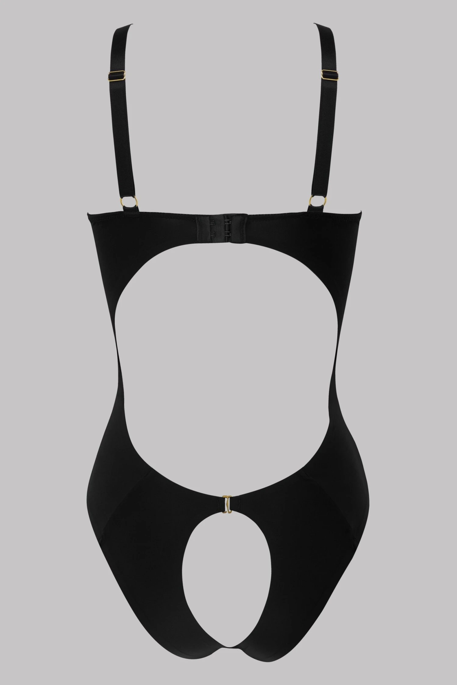 Body ouvert en microfibre opaque. Dos nu avec culotte cœur ouvrable par une accroche dorée. Ajustable au dos par un agrafage.
