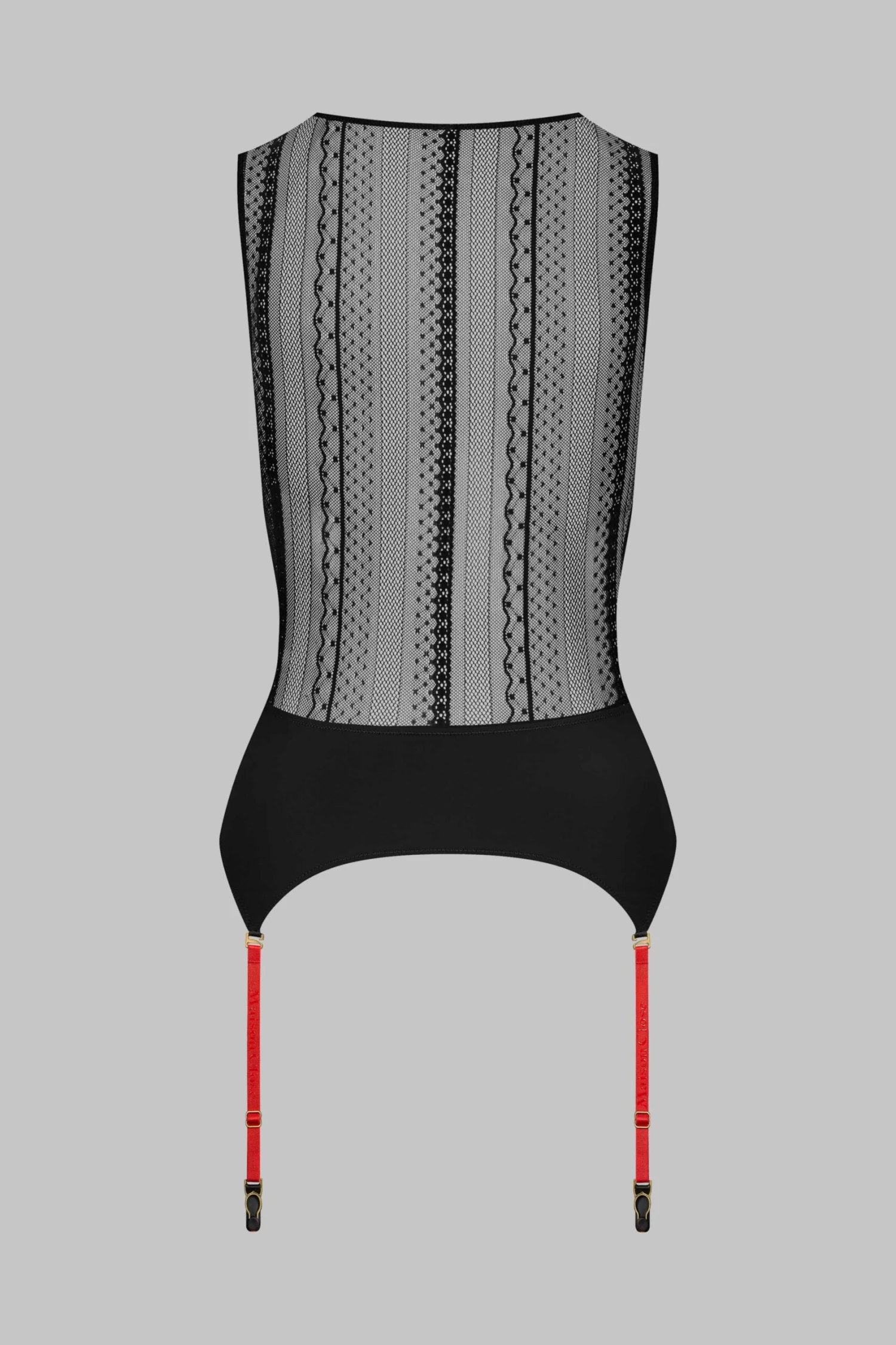 Le débardeur avec porte-jarretelles Sacré Cœur est une pièce de lingerie graphique, à l’esthétique chic et suggestive, magnifiée par le trio dentelle, résille et microfibre qui réussit à révéler la beauté de ce qu’on l’on cache.