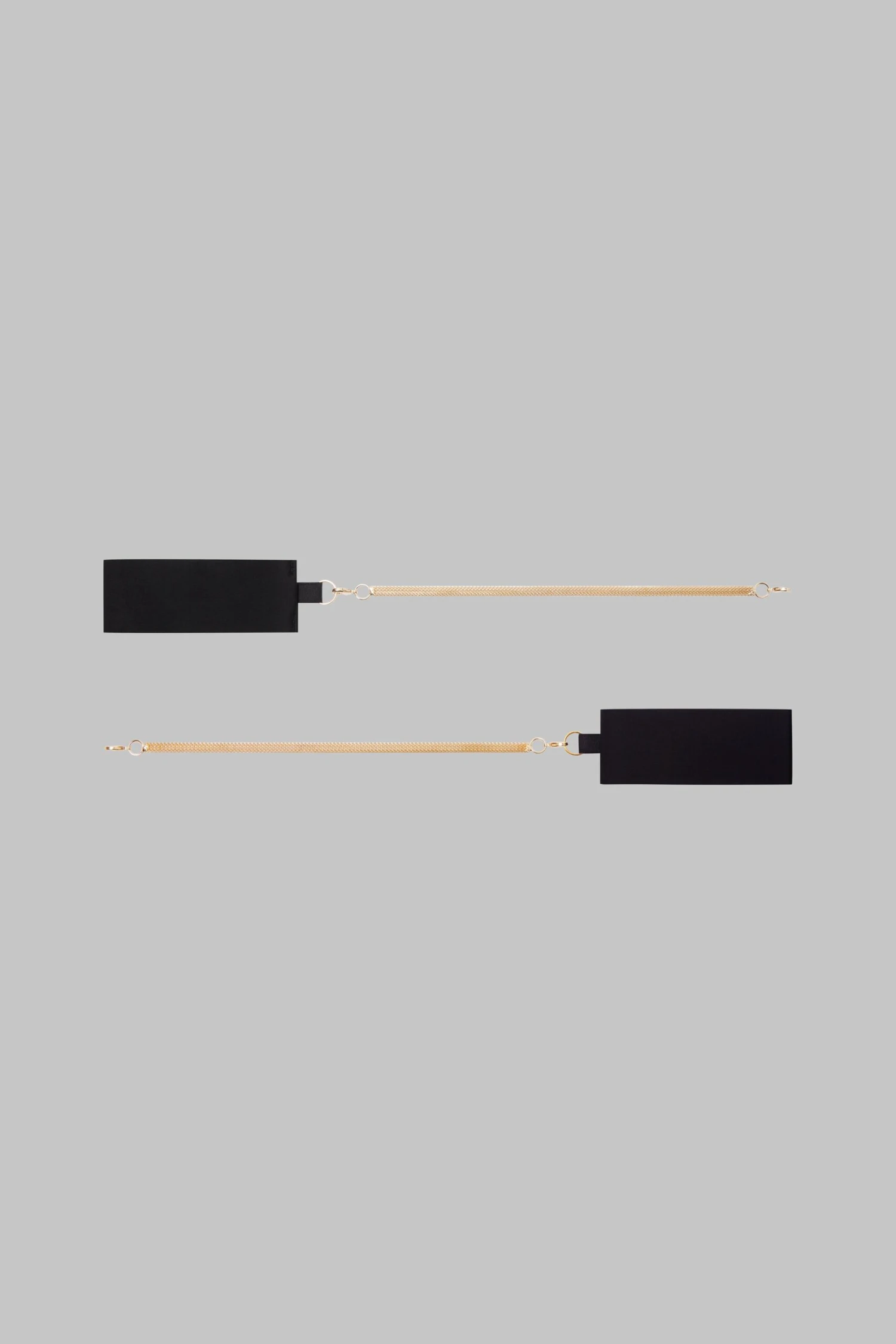 Menottes amovibles avec chaines dorées et bandes en microfibre aux poignets. Les menottes s’attachent et se détachent à l’infini, à attacher entre elles ou selon vos envies sur tout autre pièce de la collection.